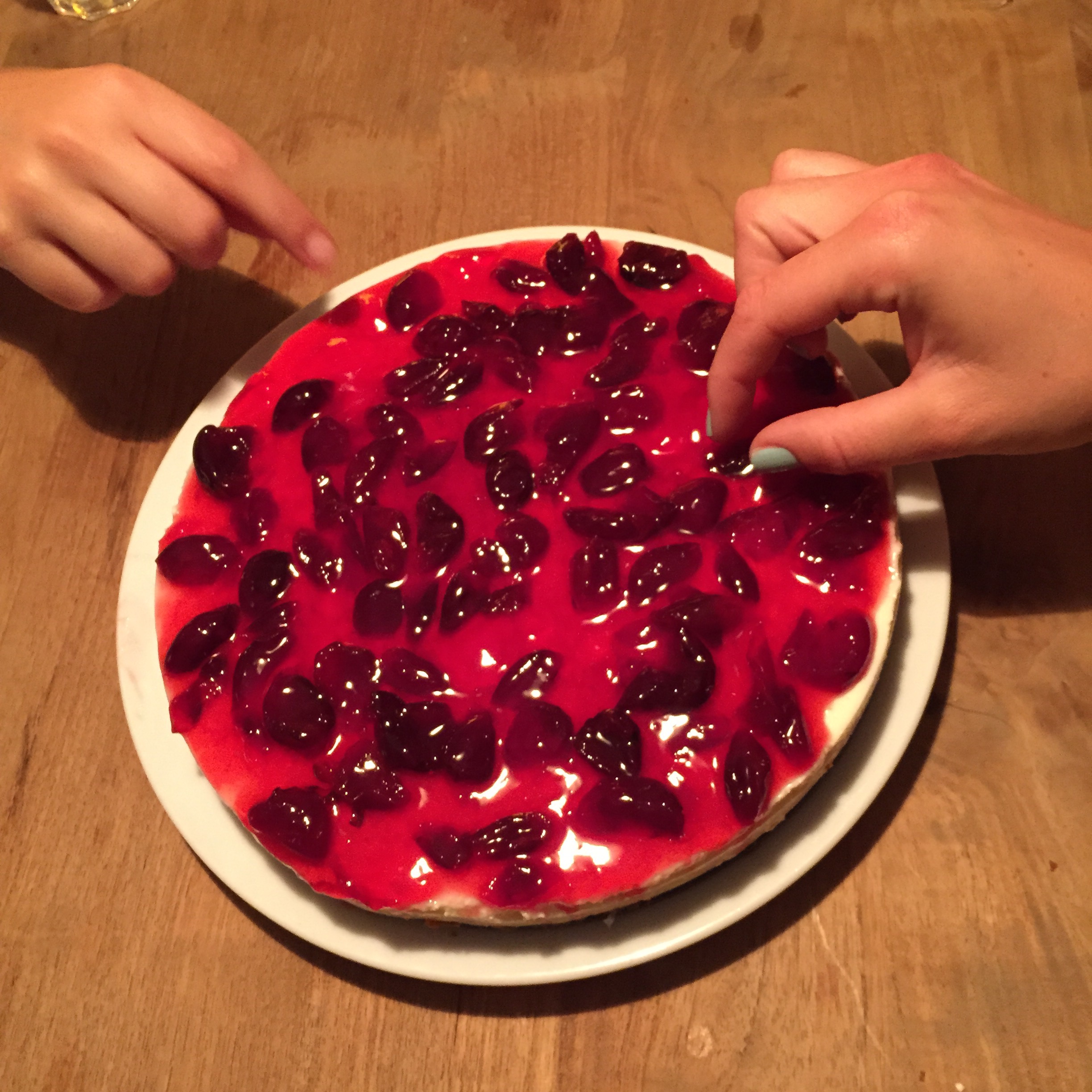 Doe wat fruit, bijvoorbeeld framboos en blauwe bes, in Ā een pannetje met wat limoensap en laat dit zachtjes inkoken. De vruchtjes worden vloeibaar en door het inkoken wordt het een soort van gelei. Is de gelei te zuur naar je smaak (ik vind dit wel lekker omdat de taart al erg zoet is), kun je altijd nog wat suiker toevoegen.