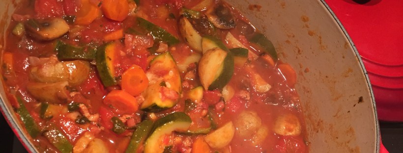 Roer af en toe door de pan, wanneer de groenten gaar zijn kan de pan op tafel, maar hoe langer het stooft hoe lekkerder…