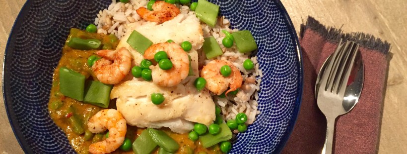 Zelfgemaakte rode viscurry met kabeljauw & gamba’s