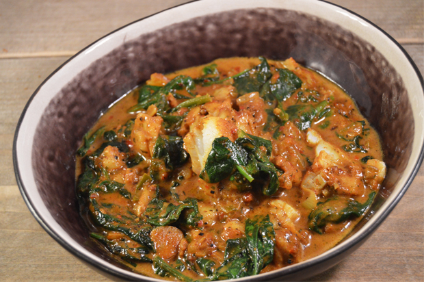 - Voeg dan de kokosmelk en de chutney toe en laat zo’n 5 minuten inkoken. Leg de spinazie erop en daar bovenop weer de kabeljauw (leg ze er een beetje in). Zet de deksel op de pan en laat 5 minuten stomen.